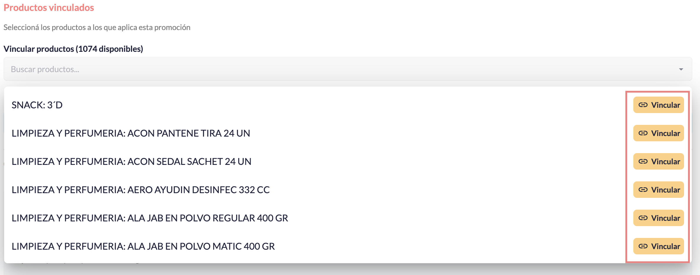 En la sección Productos vinculados, buscá y seleccioná los productos a los que querés aplicar la promoción.