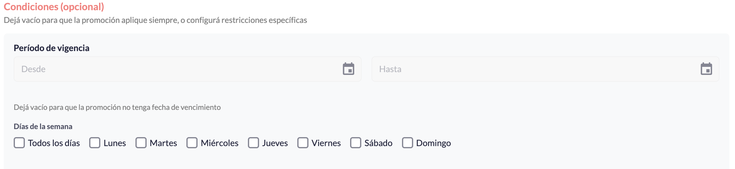 En la sección Condiciones (opcional) podés limitar cuándo aplica la promoción.